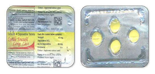 - Dosierungsformen: Tabletten (20 mg Tadalafil + 60 mg Dapoxetine pro Tablette)